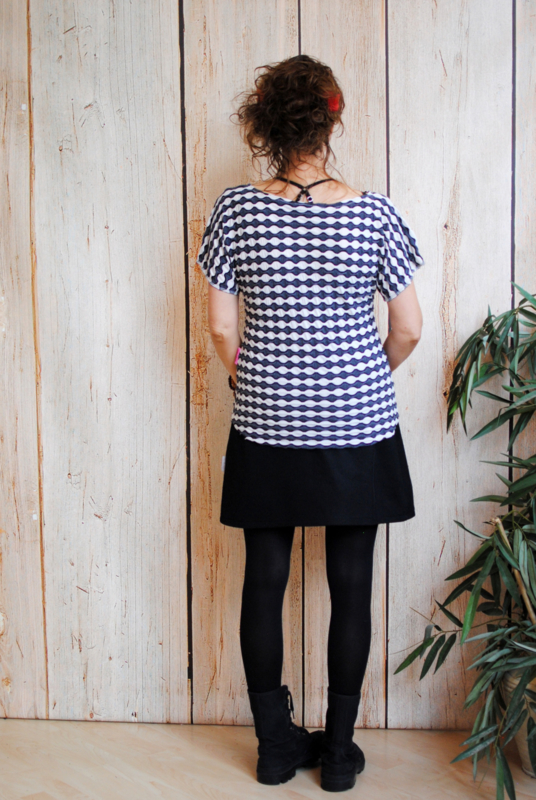 <> comfortabel en vrouwelijk model, ze sluit mooi aan bij de buste en loopt in een A lijn uit